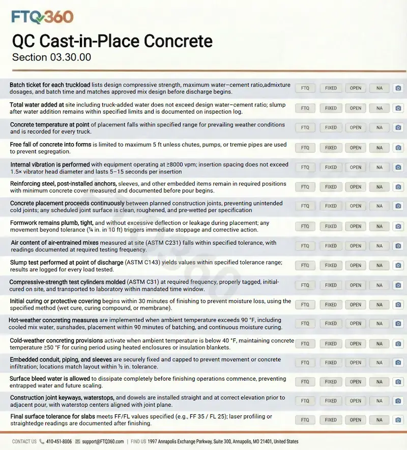 FTQ360 Inspection: Preparatory-phase confirmation of mix design and batching requirements; Initial-phase ticket photos, slump/air/temperature readings, and cylinder creation logs; Follow-Up trending identifies whether low breaks cluster by time of day, mix, or crew.