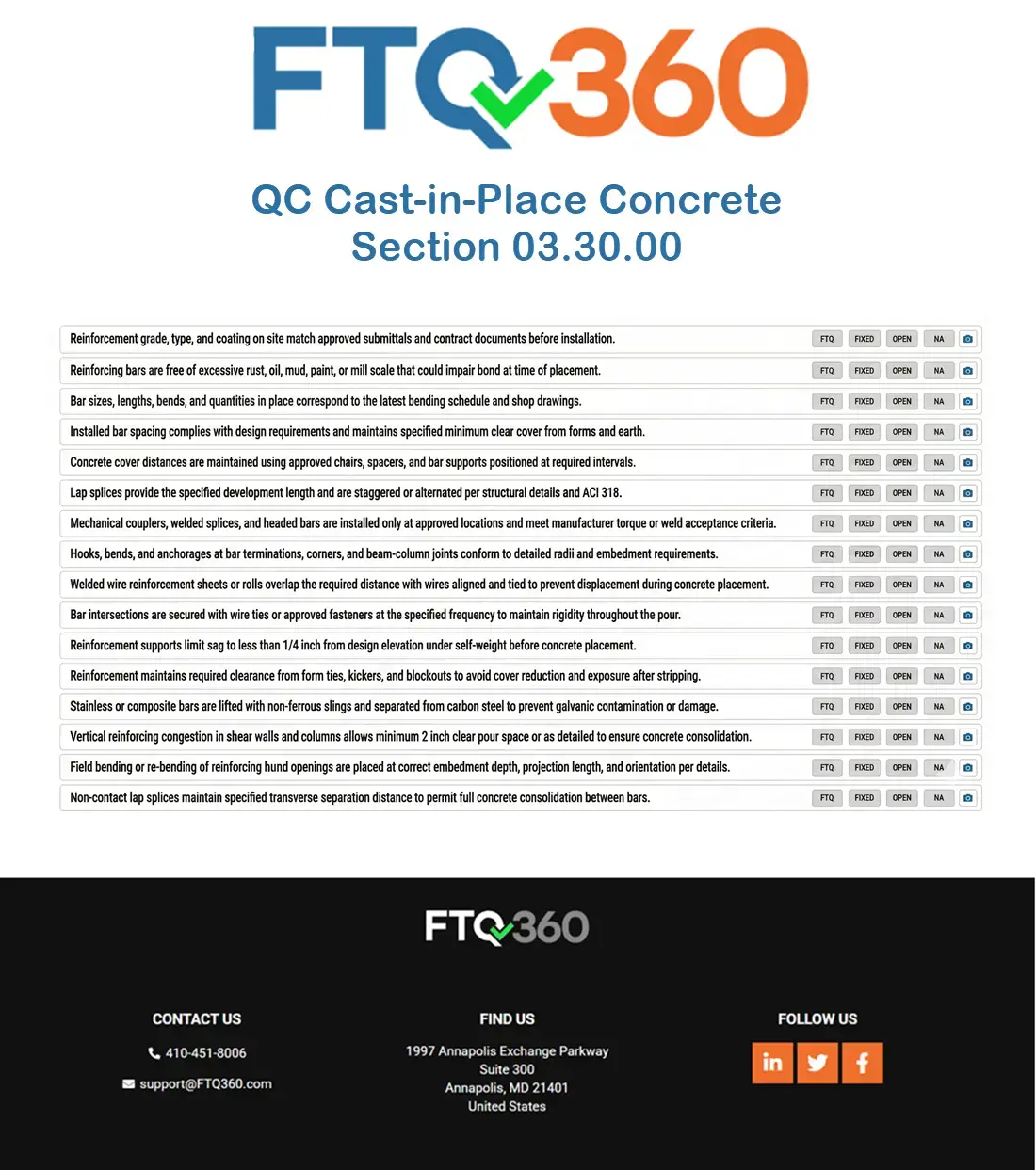 FTQ360 Inspection: Preparatory-phase pour plan defines pacing; Initial-phase time-stamped placement sequencing verifies compliance; Follow-Up trending detects delays before cold joints become systemic.