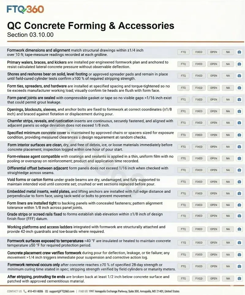 All of the work culminates with a final result; this phase ensures the completed installation meets project requirements. Inspectors verify stripping conditions, form removal timing, and surface quality. Any fins, voids, or patching needs are documented and tied back to specific forms or crews. Shoring removal is logged with supporting photos, and embed locations are confirmed for downstream trades. Records from FTQ360, alignment checks, bracing photos, joint-sealing confirmation, become part of the formal closeout package.