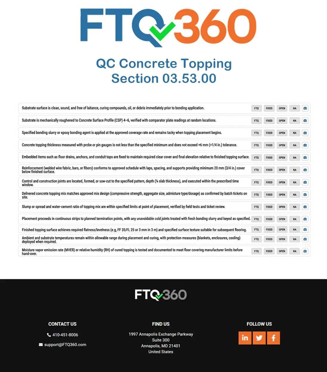 FTQ360 ties thickness checks, CSP photos, moisture tests, placement timing, and curing logs to each placement zone, creating a defensible record of topping quality.
