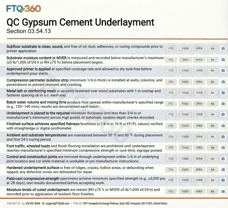 Section 03.54.13 covers gypsum cement underlayments used for leveling, sound control, and substrate preparation beneath flooring systems. Because gypsum-based products are sensitive to moisture conditions, substrate cleanliness, and primer application, deviations in preparation or environmental conditions can quickly cause soft spots, debonding, or differential curing.The three-phase QAQC flow, Preparatory, Initial, and Follow-Up, ensures substrate readiness before mixing begins, validates the first installation, and maintains consistent performance across all zones. FTQ360 ties substrate photos, CSP documentation, moisture readings, primer coverage, thickness checks, and curing logs into a complete QAQC trail for each area.