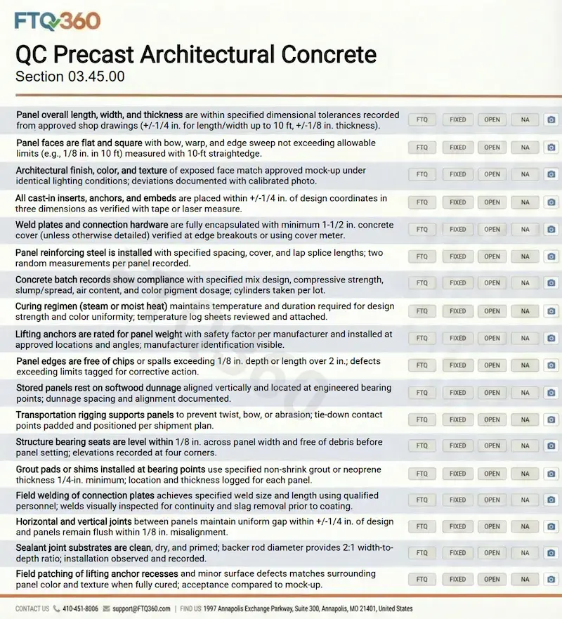 Section 03.45.00 covers architectural precast façade units, including load-bearing and non-load-bearing wall panels, spandrels, columns, trim elements, and aesthetic finishes.Because architectural precast must satisfy both structural and appearance requirements, alignment, joint control, color consistency, and handling protection all demand tight field coordination. Small errors, panel drift, surface blemishes, joint tapering, or patch mismatch, can become highly visible once units are installed.