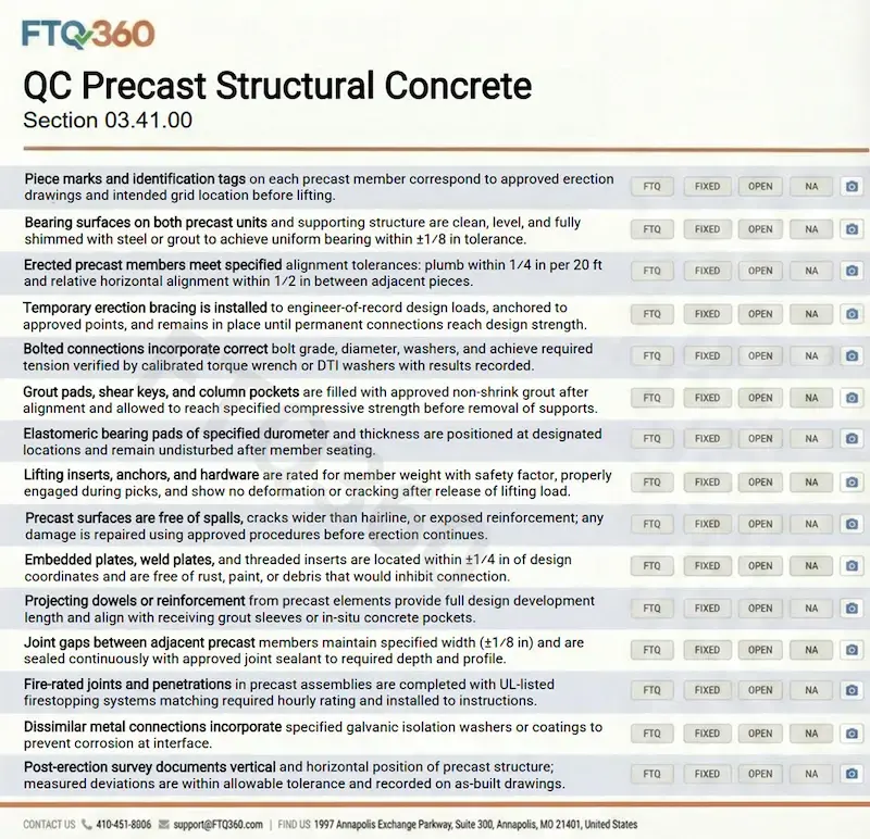 FTQ360 records camber readings, bearing conditions, connection hardware engagement, and panel alignment so you maintain a complete, traceable record of erection quality.